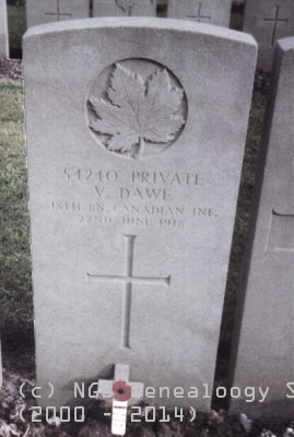 | 54240 Private Victor Dawe 18th Battalion ~ Canadian Infantry 22 Jun 1916 ? Lijssenthoek Cemetery Poperinghe, Belgium |