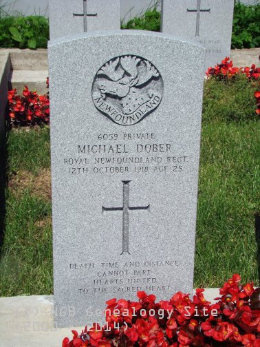 | 6059 Private Michael Dober Royal Newfoundland Regiment 12th October 1918 Age 25 ~ Death, Time and Distance Cannot Part Hearts United to the Sacred Heart |