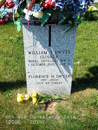 | William T. Dwyer Gunner - Royal Artilllery WW II 1 Oct 2001 Age 91 Florence M. Dwyer 1919-2000 Lest We Forget |