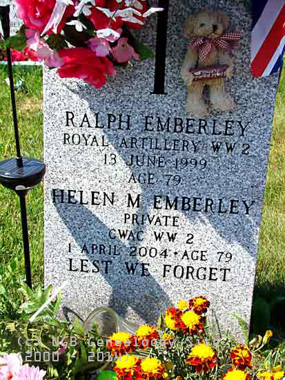 | Ralph Emberley Royal Artillery WW II 13 Jun 1999 Age 79 Helen M. Emberley Private - C.W.A.C. WW II 1 Apr 2004 - Age 79 Lest We Forget |