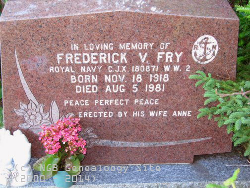 | Frederick V. Fry Royal Navy C.J.X. 180871 WW 2 Born Nov 18, 1918 Died Aug 5, 1981 ~ Peace Perfect Peace Erected By His Wife Anne |