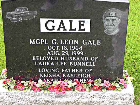 | M/Cpl G. Leon Gale 18 Oct 1964 ~ 29 Aug 1999 Beloved Husband of Laura Lee Bunnell Loving Father of Keisha, Layleigh, Sarah and Matthew Age 34 |