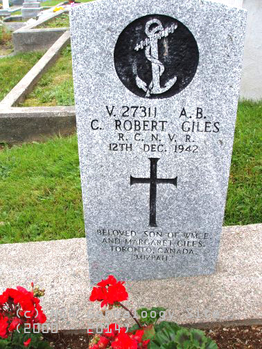 | V 27311 A.B. C. Robert Giles R.C.N.V.R. 12 Dec 1942 ~ Beloved Son Of Wm. E. And Margaret Giles Toronto, Canada "MIZPAH" |