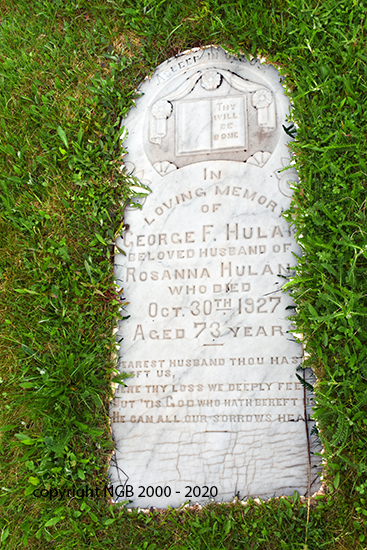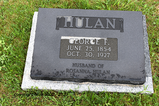 | GEORGE F. HULAN Born: June 25, 1854 Died: Oct 30, 1927 Aged: 73 Years Beloved Husband of Rosanna Hulan |