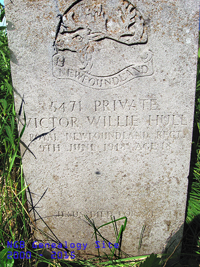 | 5471 Private Victor Willie Hull Royal Newfoundland Regt 09 Jun 1918 Age 18 ~ Jesus Died For Me ~ Victor Hull is buried at Sulian's Cove Little Bay Islands, Newfoundland. His and his sister's tombstones are the only ones in this abandoned cemetery. |
