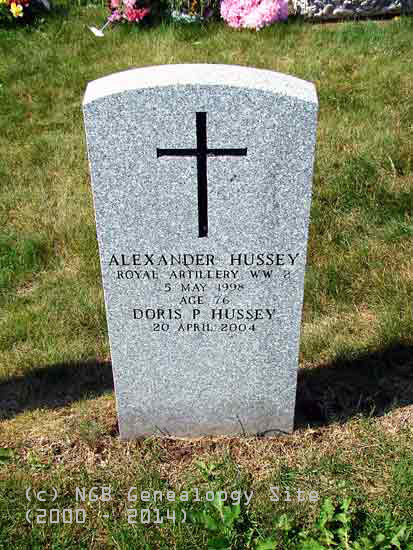 | Alexander Hussey Royal Artillery WW II 5 May 1998 Age 76 Doris P. Hussey 20 Apr 2004 |
