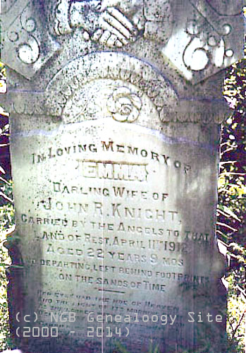 In Loving Memory of EMMA Darling Wife of John R. Knight, Carried by the Angels to that Land of Rest April 11th 1912 Aged 22 Years 9 Mos And departing left behind footprints on the sands of Time Her eyes had the hue of Heaven And the light of its morning glow As she looked with Prophetic vision O'er the way that her feet must go. Carried high on Angels pinions To the Haven of Repose She has entered God's dominion And the joy of Heaven knows