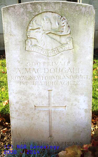 | 900 Private A. MacDougall Royal Newfoundland Regiment 1st Jul 1916 Age 28 |