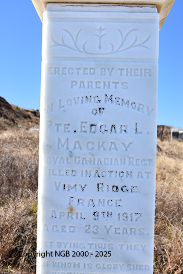 | Pte EDGAR L. MacKAY Royal Canadian Regiment Died: April 9th 1917 Aged: 23 Years Killed in Action at Vimy Ridge France |