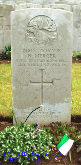 | 2180 Private N. Mercer Royal Newfoundland Regiment 21 Apr 1917 Age 24 ~ Not As I Will, But As Thou Wilt S. Matt XXVI 39 |