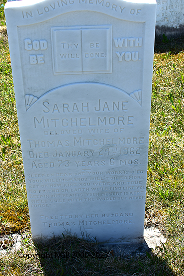 | SARAH JANE MITCHELMORE Died: Jan 24th 1962 Aged: 73 Years 6 Months THOMAS MITCHELMORE SR. Died: Jan 14th 1965 Aged: 79 Years 10 Months |