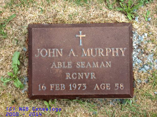 | John A. Murphy Able Seaman Royal Canadian Naval Volunteer Reserve 16 Feb 1973 Age 58 |