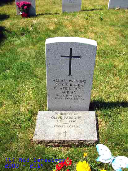 | Allan Parsons R.C.C.S. Korea 13 Apr 2000 Age 80 Olive B. Parsons 1916-1990 Age 74 |