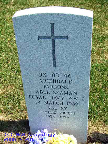 | JX 183546 Archibald Parsons Able Seaman - Royal Navy WW II 14 Mar 1989 Age 67 Phyllis Parsons 1924-1999 |