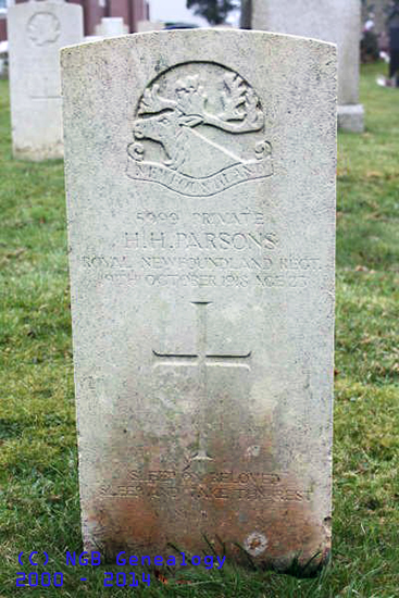 Private H. H. Parsons Royal Newfoundland Regiment 19 Oct 1918 Age 23 Plymouth [Efford] Cemetery United Kingdom |