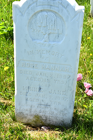| ROSE HANNAH PAYNE Died: Jan 2, 1897 Aged: 13 Years MINNIE JANE PAYNE Died: Jan 3, 1897 Aged: 8 Years Beloved Daughters of Esau & Sarah Jane Payne |
