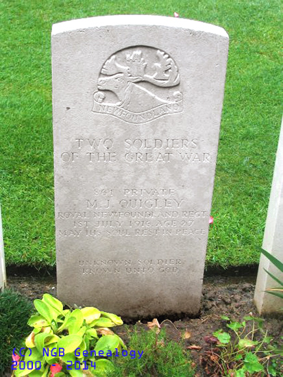 | 861 Private M.J. Quigley Royal Newfoundland Regiment WW I 1 Jul 1916 Age 27 |