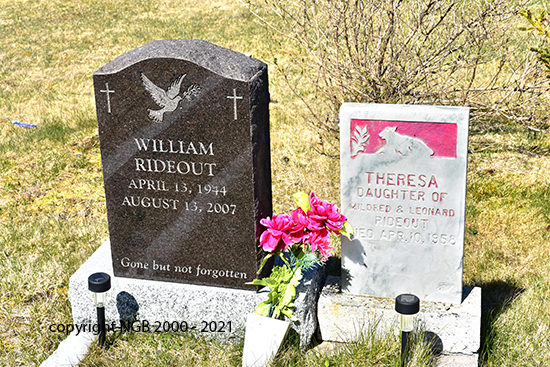 | WILIAM RIDEOUT Born: April 13, 1944 Died: Aug 13, 2007 THERESA RIDEOUT Died: April 10, 1958 Daughter of Mildred & Leonard Rideout |