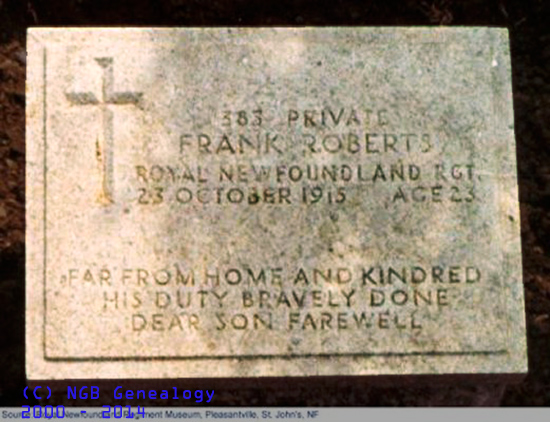 | 383 Pte Frank Roberts Royal Newfoundland Regiment 23 Oct 1915 Age 23 Hill 10 Cemetery Gallipoli, Turkey |