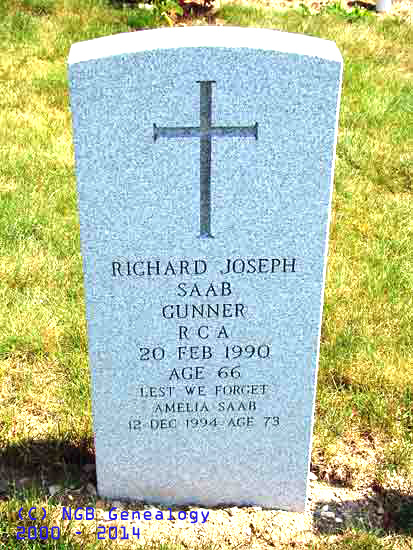 | Richard Joseph Saab Gunner - R.C.A. 20 Feb 1990 Age 66 Lest We Forget Amelia Saab 12 Dec 1994 Age 73 |