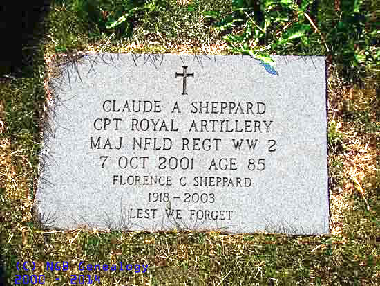 | Claude A. Sheppard Captain - Royal Artillery Major - Newfoundland Regiment WW II 7 Oct 2001 Age 85 Florence C. Sheppard 1918-2003 Lest We Forget |