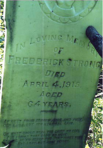 In Loving Memory of Frederick Strong Died April 4, 1915, Aged 64 years. At Rest from sorrow, care, and pain, Our loss but his eternal gain. Oh what could heal the gulf we feel For forms that come no more Had we not heard the Scripture's word Not lost, but gone before.