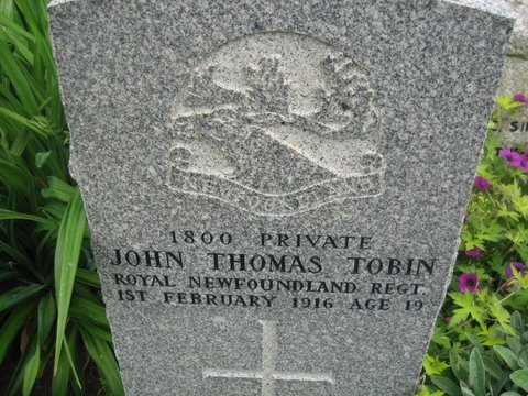 | Regimental # 1800 John Thomas Tobin Private - Royal Newfoundland Regiment 1 Feb 1916 Age 19 |