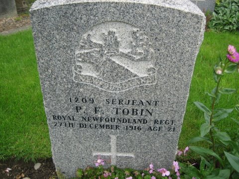 | Regimental # 1209 P.F. Tobin Sergeant - Royal Newfoundland Regiment 27 Dec 1916 Age 21 |