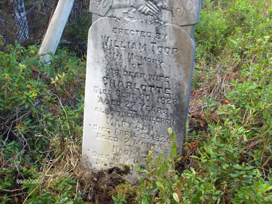 Died: Sept 30, 1928 Aged: 27 Years MARY ANN TOOP Died: April 5, 1926 Aged: 7 Months NAOMI TOOP Died: Nov 15, ??? |