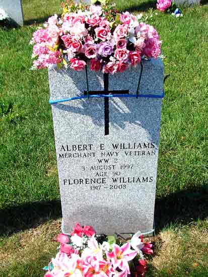 | Albert E. Williams Merchant Navy Veteran WW II 3 Aug 1997 Age 90 Florence Williams 1917-2003 |