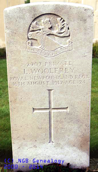 | 2707 Private L. Woolfrey Royal Newfoundland Regiment 16 Aug 1917 Age 24 |