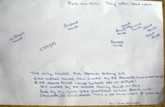 This is the back of the picture identifying the buildings in the previous photo of the Harbour in Port au Bras, the day after the Tidal Wave. Reproduced here with the permission of Trina Kennedy |