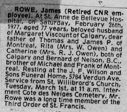 John W. Rowe, Oct.19, 1933, age 23 yrs. 6 mos. Francis Rowe, Sept. 22, 1951, age: 83 years [Newspaper obit for James Rowe died Feb. 29, 1977]