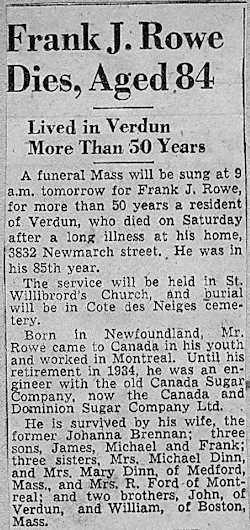 Francis Rowe, oldest son of James Rowe and Mary Murphy was married on the fourth of July, 1905 to Johanna M. Brennan, second daughter of Dan'l Brennan and Johanna Boland by Rev. F. McGinnis in the Church of Our Lady of Sorrows, Verdun. |