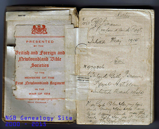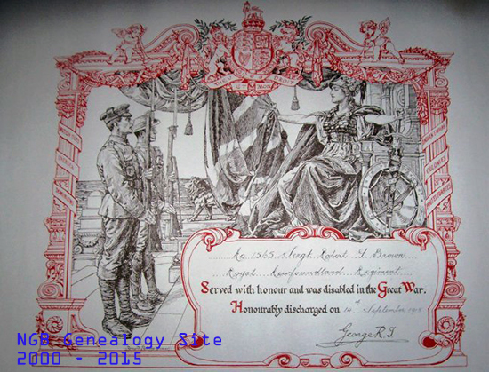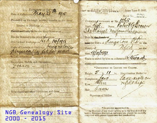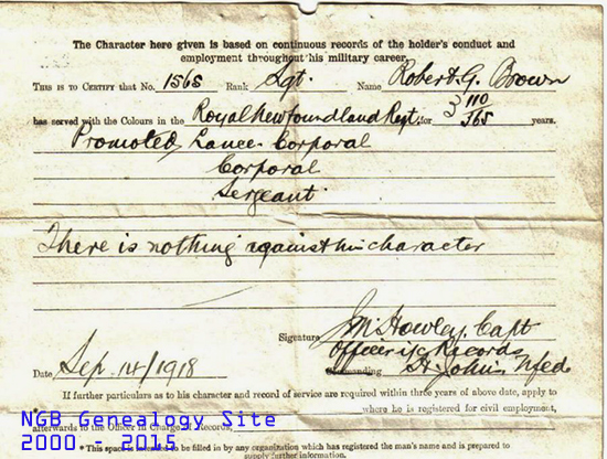 | Robert was born in King's Cove, Bonavista Bay, Newfoundland. He enlisted on 28 May 1915 and was discharged on 14 September 1918. The original Character Certificate of Sgt. Robert Gill Brown No 1565. Donated by Keith Brown Front |