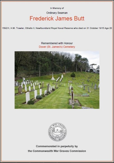FREDERICK JAMES BUTT Frederick James Butt was born in Freshwater, Bay de Verde, on October 14th, 1893. He was one of ten children born to George and Mary Butt. On January 25th, 1915, he signed up with the Newfoundland Royal Naval Reserve. In the role of Ordinary Seaman, he was assigned to the trawler, HMT Othello II, which was serving as a minesweeper. On October 31st, 1915, at 11:55 am, while in the English Channel, off Leathercoat, Kent, HMT Othello II was sunk by a mine from the German submarine UC-6, Captained by Matthias Graf von Schmettow. Nine souls were lost and only one survivor. A Cabin Boy (name unknown), was in the wheelhouse at the time with the second-hand, skipper and helmsman. The three men managed to squeeze and push him through a window opening. They could not follow and went down with the ship Seventeen days earlier, Fred had celebrated his 22nd Birthday. He had only been serving his King and Country for little more than ten months. He was the only Newfoundlander on the ship, the rest of the crew were from England. Through the Commonwealth War Graves Commission, all nine men are buried in Dover (St. James's) Cemetery, Kent, England. |