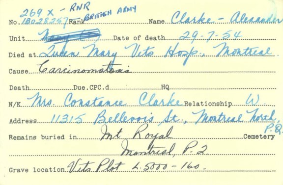 Alexander Clarke originally from Delby's Cove, Trinity Bay, NL Previous service: Posted to No. 5 Centre, Woodfall Estate, Liverpool as PTE 26 July 1940 Military conduct Good during his short period of service NOK: Mrs Clara Maud Clarke (nee Whitty)