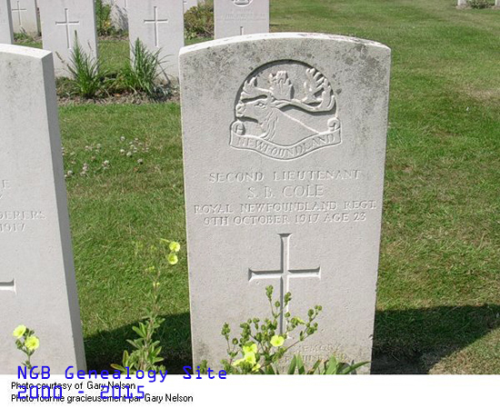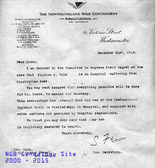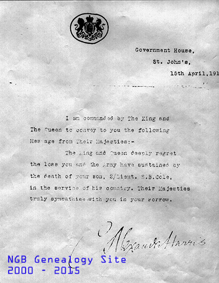 Dear Madam, I am desired by the Committee to express their regret at the news that Private S. Cole is in Hospital suffering from Frostbitten feet. You may rest assured that everything possible will be done for him there, to assist his recovery. This association has arranged that all men of the Newfoundland Regiment shall be visited while in Hospital, and supplied with extra comforts not provided by Hospital regulations. We trust you may soon hear that your son is completely restored to health. Yours Sincerely, Letter from Government House dated 15 Apr 1918 signed by Gov. Harris I am commanded by the King and The Queen to convey to you the following Message from their Majesties: The King and Queen deeply regret the loss you and the Army have sustained by the death of your son, 2/Lieut. S.B. Cole, in the sevice of his country. Their Majesties truly sympathize with you in your sorrow. |
