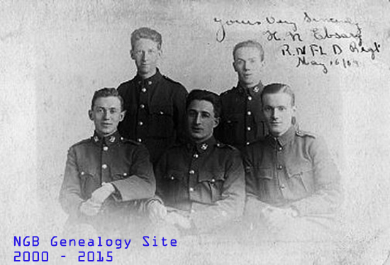 | Donated by Jackie Ebsary Newman Ebsary resided at 89 Southside Rd in St John's and he was a marine engineer by trade. All five of Newman Ebsary's sons and his son-in-law signed up when volunteers were called for during World War 1. Albert and William did not go overseas. Albert was a cook on the ships that took the men overseas during the war. William was a cook at the convalescent hospitals in St John's. Young Fred died of meningitis in Egypt, Joseph Hollahan was killed in action July 1, 1916, and Samuel died as a result of wounds at a later battle. Jean Hardy remembers that every July 1st, Newman climbed the hill behind his house and flew Samuel's flag at half mast. Newman died Dec 31, 1941. The five sons and one son-in-law are listed below. |