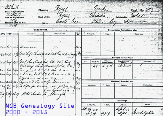 on November 14,1917, and was sent overseas in England. He was wounded on October 23, 1918 and admitted to Mile-End Military Hospital in London where he was treated for a gun shot wound to the hand,(compound thumb fracture) He returned to St. John's, Newfoundland from Liverpool in 1919, served a liitle time in St. John's before returning to live in Brent's Cove in 1921. Frank died on June 1, 1922. |