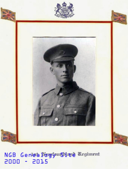Mother: Martha King Address: Catalina, Trinity Bay Age on Enlistment: 21 yrs old Enlisted: Feb 20, 1915 Service Record Details: 1.9.15 - Disembarked Alexandria 18.10.15 - Embarked for Gallipoli 25.10.15 - Joined Unit 1.1.16 - Jaundice Adm St. Paul’s Hosp Malta on H/S Oxfordshire from Cape Holland 3.4.16 - Transferred to [?] 19.4.16 - Transferred to Lines of Communication 1.6.16 - Class P.B. Loss of Fingers at 29 J.B. Depot Rouen with Battalion France 19.6.16 - Attached to Duty H Co 2nd Battalion [?] 12.10.16 - Clash [Pemented] [Bank] Transferred to England to report at Depot Ayr 25.4.17 - Discharged Hospital Fit for duty order to report at Depot Ayr 4.5.17 - Posted to HQ St. John’s, Embarked Liverpool to St. John’s 21.5.17 - Attached to Strength, St. John's 12.1.18 - Employed for recruitment with L/C Pittman with effect from November 26th 1917 12.1.18 - Employed for recruitment is struck off the strength with affect from December 25th 1917