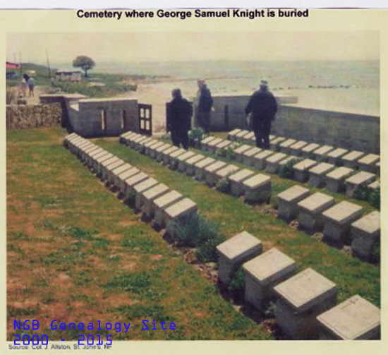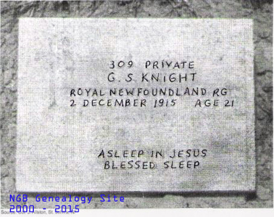 George was the son of Charles and Phoebe Knight of 27 William Street, St. John's, Newfoundland. He was a "Blue Puttee". George was killed in the Dardanelles on 2 Dec 1915 at age 21 and is buried Azmak cemetery, Turkey.