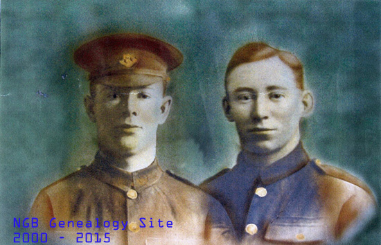 [wearing cap] and John Maynard Regt # 4096 The photo was taken in April of 1917 in France on William's 19th birthday. John was 17. Photo donated by Eric McHugh |