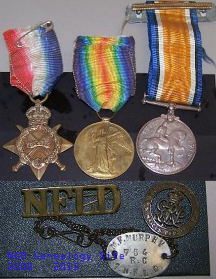 Donated by Brendan Murphy One of the original"C"Company of the Royal Newfoundland Regiment. "Mike", as he was familiarly known, saw service in: Gallipoli Nov 12,1915 - Jan 6,1916 Egypt Jan 10 - March 15,1916 France March 22 - July 8,1916 and Oct 2,1916 - July 4,1918. |