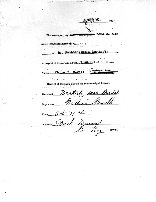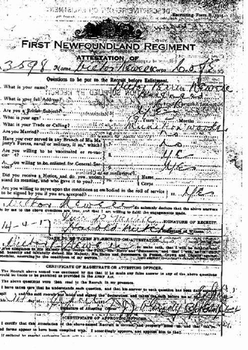 | Pte Victor Perrin Newell Regt # 3598 Donated Linda Perron and Albert Kenneth Newell Born: Barreneed, Conception Bay, NF. Died: 17 Jul 1917 Father: Nathan Newell Pte Newell's Enlistment Pte Newell's War Medal |