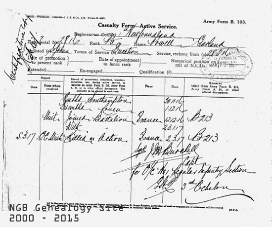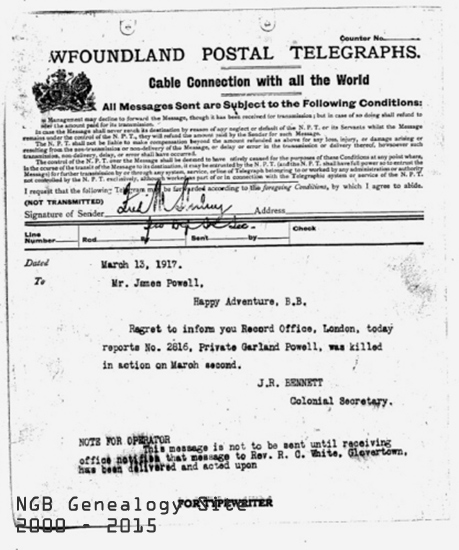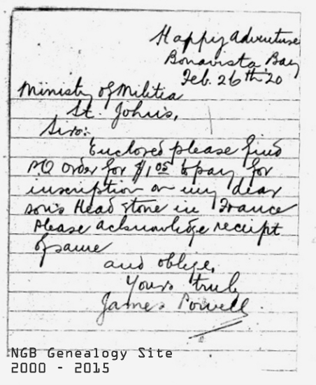 application Embarked from St John's for UK on the SS Sicilian, Aug 28, 1916 Embarked Southampton Nov 30, 1916 Disembarked at Rouen Dec 1, 1916 Joined C Company Dec 12, 1916 KIA France Mar 2, 1917 Awarded two medals - Victory Medal and British War Medal. Medals delivered to father, James Powell Dec 8, 1921 Burial information: Garland was killed in action at Sailly-Saillisel and is remembered on the Beaumont-Hamel Memorial. A headstone was erected by his parents in his memory in the Eastport Holy Cross Anglican Cemetery. Below are links to excerpts from Pte Powell's War Record Use the "back" button to return to this page Death Certificate as donated to the Legion branch 41 in Eastport Telegraph advising family of death, Mar 13, 1917 Casualty Form A letter written by my great-grandfather in Feb 1920 to the Ministry of Militia, requesting a headstone inscription. The response from the M of M to the letter. Receipt for 2 medals |