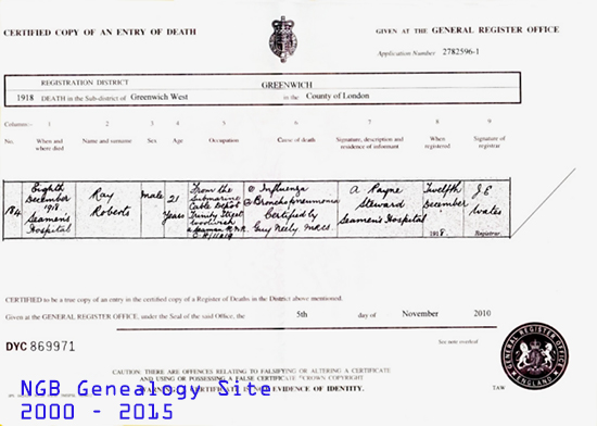 Ray worked at the Submarine Cable Depot with the Royal Naval Reserve and died at 21 as a result of the flu and bronchial pneumonia. |