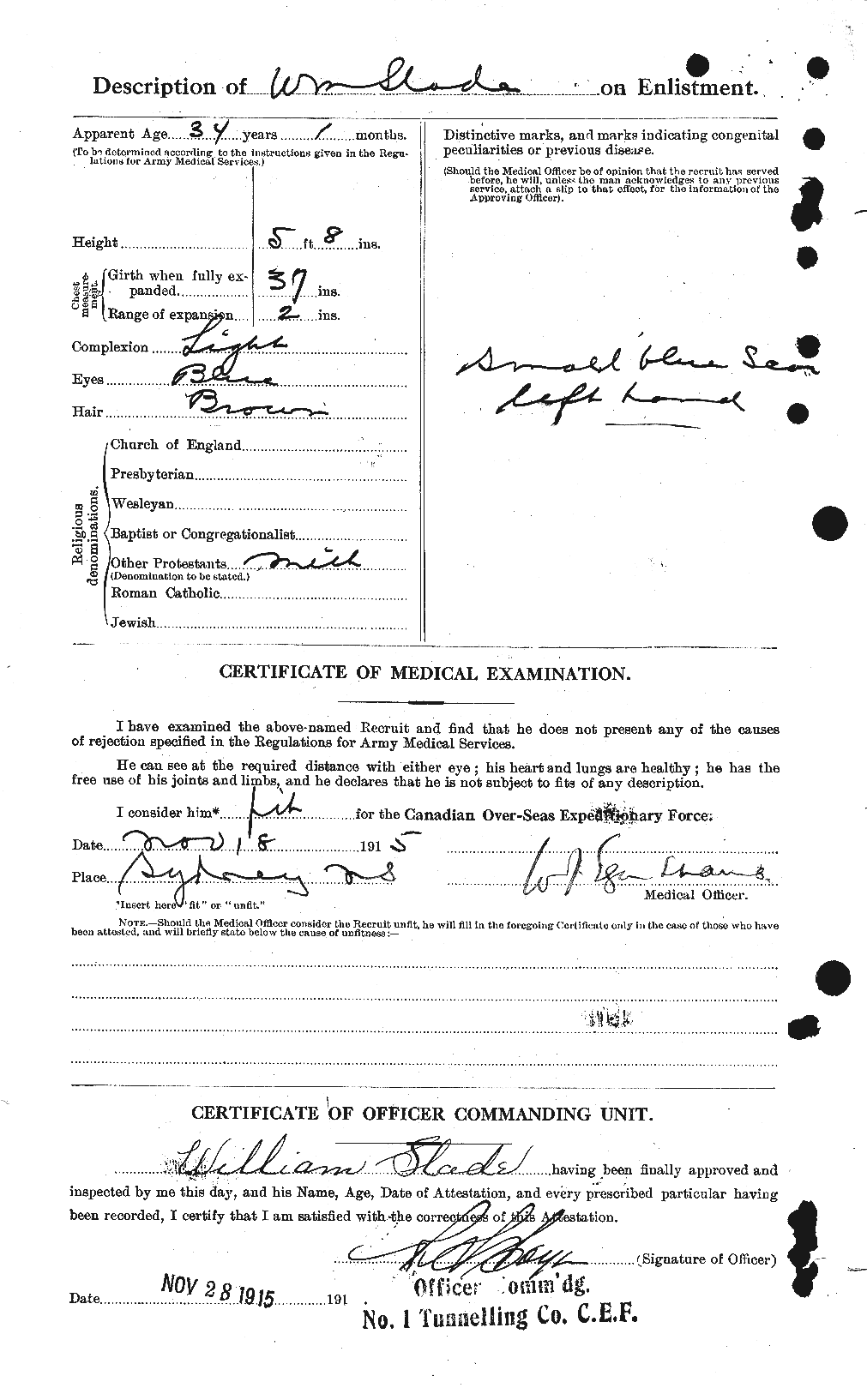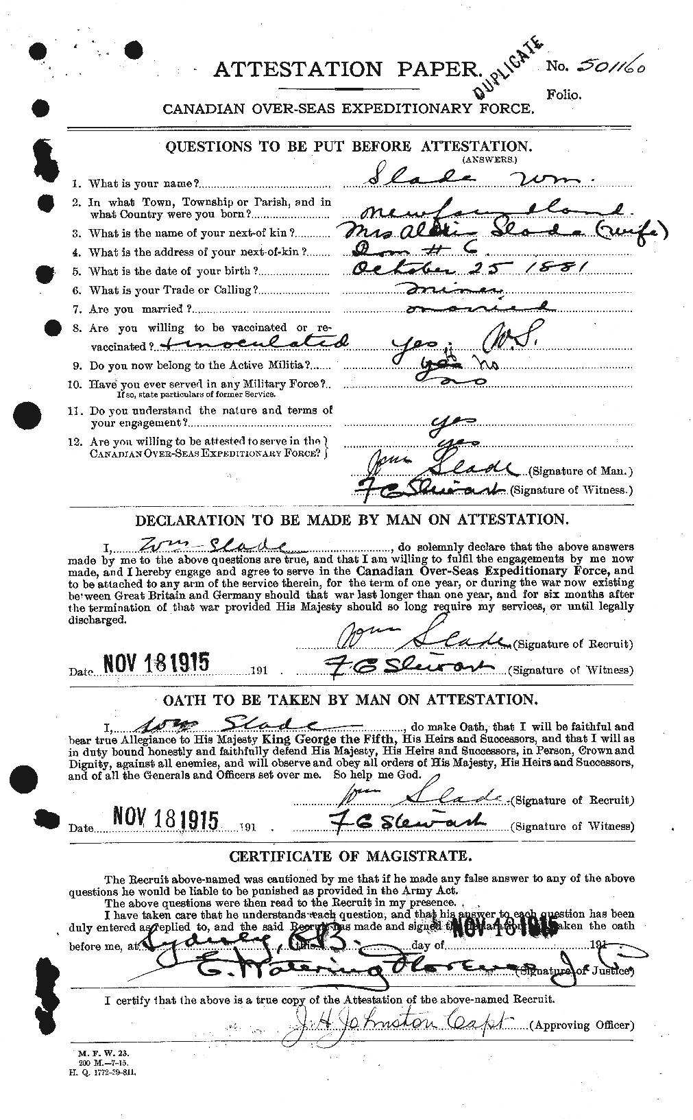 He joined the Canadian Expeditionary Force on 18 Nov 1915. William Slade's Attestation Paper [Use the "back" button to