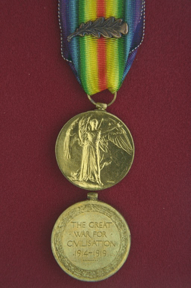 TERMS The medal was awarded to all ranks of the fighting forces, to civilians under contract, and others employed with military hospitals who actually served on the establishment of a unit in a theatre of war between 05 August 1914 and 11 November 1918 (inclusive). It was also awarded to members of the British Naval mission to Russia 1919 - 1920 and for mine clearance in the North Sea between 11 November 1918 and 30 November 1919. This medal was never issued alone and was always issued with the British War Medal. BARS Only the Mentioned-in-Despatches oak leaf emblem is worn on this medal when it was awarded for WWI. There were no other clasps. DESCRIPTION A circular, copper medal, lacquered bronze, 1.42 inches in diameter. OBVERSE The obverse shows the winged, full-length, full-front, figure of Victory, with her left arm extended and holding a palm branch in her right hand. REVERSE The reverse shows the legend THE GREAT / WAR FOR / CIVILISATION / 1914 - 1919 in four lines, surrounded by a wreath, with dots below the words. MOUNTING A ring (0.5" diameter) passes through a loop fixed to the top of the medal. The ring moves forwards and backwards but not sideways. RIBBON The watered ribbon is 1.5 inches (39 mm) wide, and consists of nine coloured stripes: violet, blue, green, yellow, red (centre), yellow, green, blue, and violet. DATES The Inter-Allied War Medal was agreed to by all allies in March 1919. All medals were to be almost identical to obviate the need to exchange allied medals and each was patterned after a French medal of 1870. The medal was authorized in Britain (and for Canadians) on 01 September 1919. NAMING The recipient's name, number and rank are engraved on the rim for the first issue. |