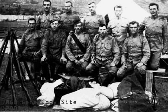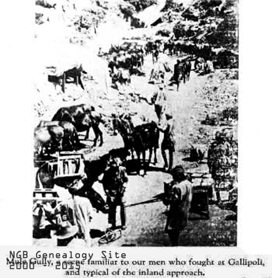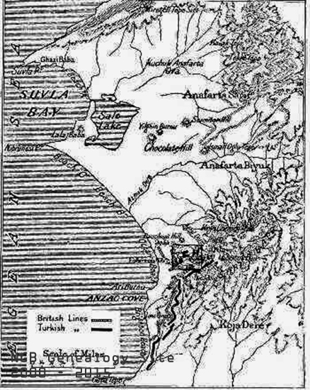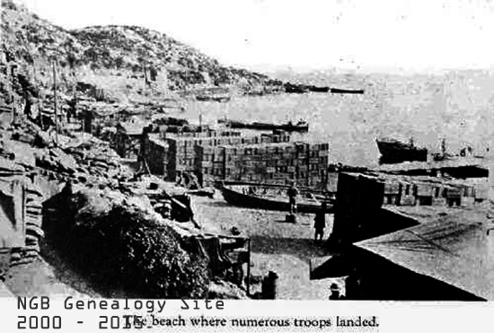 2nd from back: S. Goodyear, A. Penny, A.S. Newman, W.Manstan, W. Ryall, N. MacLeod, J. Williams, J. Robinson, W. Clare, J. Gardner, C. Dulley, E. Butcher, C. James, G. Hicks, J. Bethune, S. Smith, W. Ayre. 3rd from back: S. Ferguson, C. Oke, G. Taylor, C. Strong, W. Edwards, B. Dicks, E. Ebsary, M. McKay, G. Paver, H. McNeill, H. Ross, R. Ferguson, W. Miles, L. Murphy, C. Melville, L. Stick, H. Peckham, D.Eaton. Front Row: M. Nugent, E. Barnes, R. Kershaw, G. Byrne, J. Snow, E. Churchill, G. Langmead, E. Edwards, R. Stick. It was in the face of these difficulties and others of scarcely less magnitude that the Gallipoli campaign was carried on from April 25, 1915, when the first landing was effected, until the first days of 1916. The fighting during May, June, July and the first part of August was very sever, and costly in human life. Not only, however, was the German boast that the Allied troops would not land settled for all time, but great successes were achieved and possession taken of a considerable portion of the Peninsula. The record is one of glorious sacrifice and unsurpassable courage. The Allied offensive terminated with the failure of the thrust at Sari Bair, August 6th-10th. It failed through lack of sufficient men and water. The five days’ battle on a front of twelve miles has cost the Allies almost a quarter of their entire Gallipoli army. Fifty thousand men, with large quantities of food and ammunition supplies would be required for another attack. It was decided that these should not be sent, and after several thrusts during the latter days of August the fighting on both sides settled down into trench warfare. Regiment Landed at Suvla. This, then, is the situation both as regards the nature and the stage of the Gallipoli campaign, when, in the early morning of September 20, the Newfoundland Regiment landed on the beach at Suvla, and was shelled for the first time by the enemy. The beach was piled high with ammunition, sandbags, large and small guns and innumerable other things that go to make up the equipment of an army. The ground inland was very hilly and in some places set with steep cliffs, and as our men moved off in this direction in small platoons the Turkish shell fore became heavier. One officer and eight men of other ranks were wounded during the first day. As night came on, under cover of darkness, our Regiment marched toward the trenches, about four miles distant, A Company taking a position in the support trenches. Each day a new company went into the support trenches and on the 24th A and B Companies relieved the Worcester and Hampshire Regiments respectively. These two regiments with the King's Own Scottish Borderers and now the Newfoundlanders constituted the 88th Brigade, and formed part of Sir Ian Hamilton’s “incomparable Twenty-ninth Division.” Page Twenty